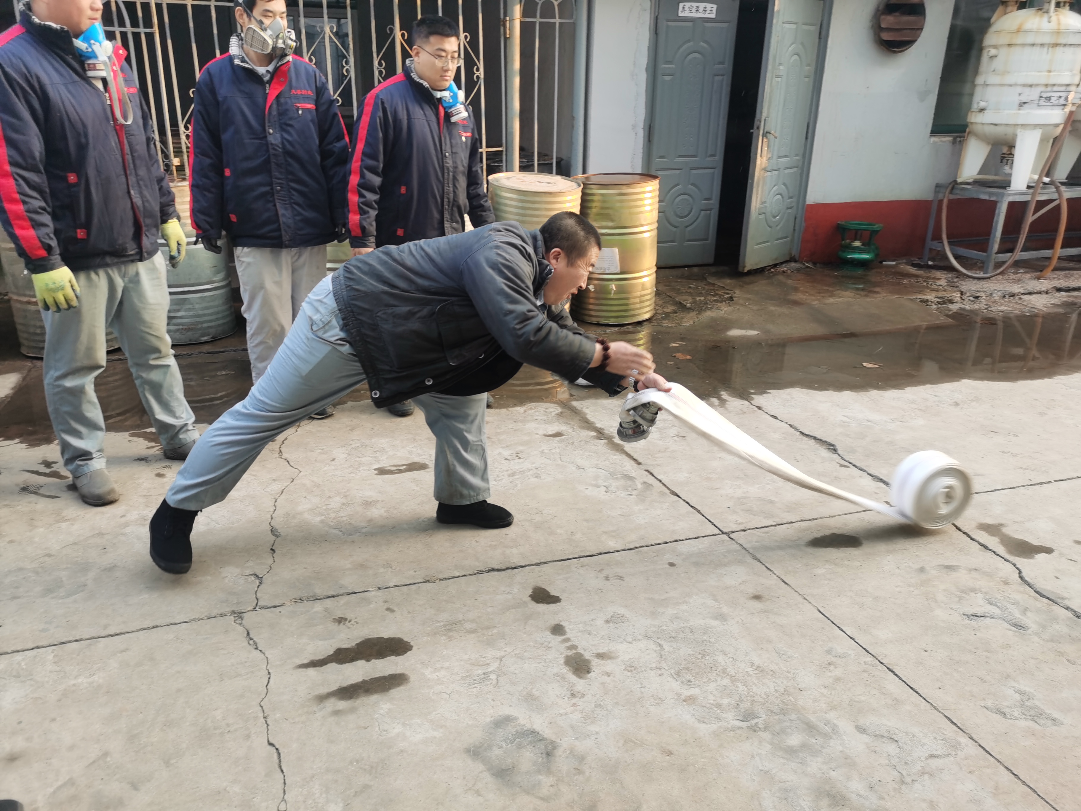 演練模擬原料車間合成一室發(fā)生火災(zāi)爆炸,車間立即啟動(dòng)應(yīng)急預(yù)案,進(jìn)行實(shí)際演練。