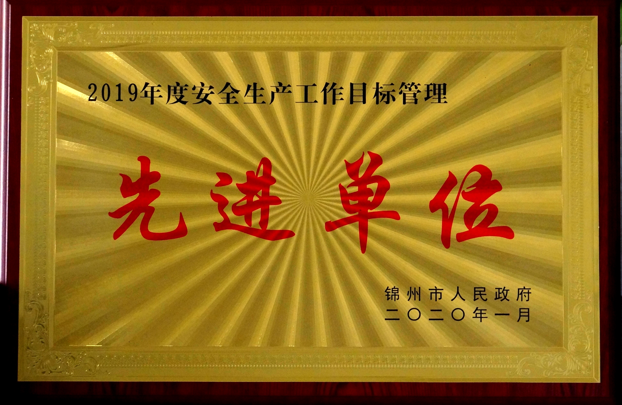 公司被錦州市政府授予“2019年的安全生產工作目標管理先進單位”榮譽稱號